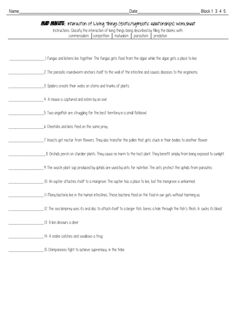 Identify symbiotic relationship type in 15 scenarios. ... Symbiosis Symbiotic Interactions Relationship Worksheet Key, Exercises for Animal Biology.