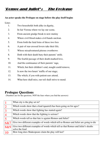 3. $1.00. PDF. This packet includes two worksheets that help students work through the elements of the Prologue in Romeo and Juliet. Worksheet 1: The Shakespearean SonnetIn this activity, students will evaluate the prologue for elements of the Shakespearean sonnet. Students will mark the meter and rhyme scheme, as.