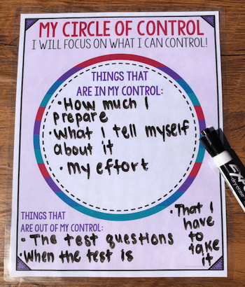 Take a large piece of paper and draw a big circle In the middle of the circle write your child's name then put "I can control." Explain to your child what the circle of control is. Tell them that there are things in life they cannot control and we should not waste our time on those things. Help your child come up with examples of them.