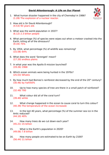 Dec 22, 2021 · (more details for Planet Earth *) This Video Response Worksheet and Key is based on the BBC documentary series "Planet Earth - Episode 3: Fresh Water."(NOTE: These worksheets are based on the British version of Planet Earth [Season 1], narrated by David Attenborough. It uses the metric system and is, at the time of this posting, the. Planet ...
