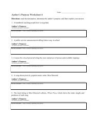 Online. Author's Purpose Worksheet 3. Here are thirteen more problems to give students practice identifying the author's purpose in a variety of texts. The texts range from comic books to directions to the mall, so this activity sheet will get your students thinking. There is also an online version available.