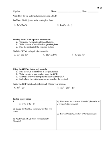 Lesson 8: Factoring Trinomials of the form 2+ + , where ≠ 1 pg. 15 Review More Practice Factoring with Pizzazz worksheets pg. 16-30 . Page 2 . Page 3 Lesson 1: Factoring using the Greatest Common Factor Factor each expression by factoring out the GCF. 1.) ...