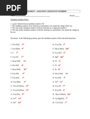 Oxidation Numbers Worksheet. Directions: Use the Rules for Assigning Oxidation Numbers to determine the oxidation number assigned to each element in each of the given chemical formulas.