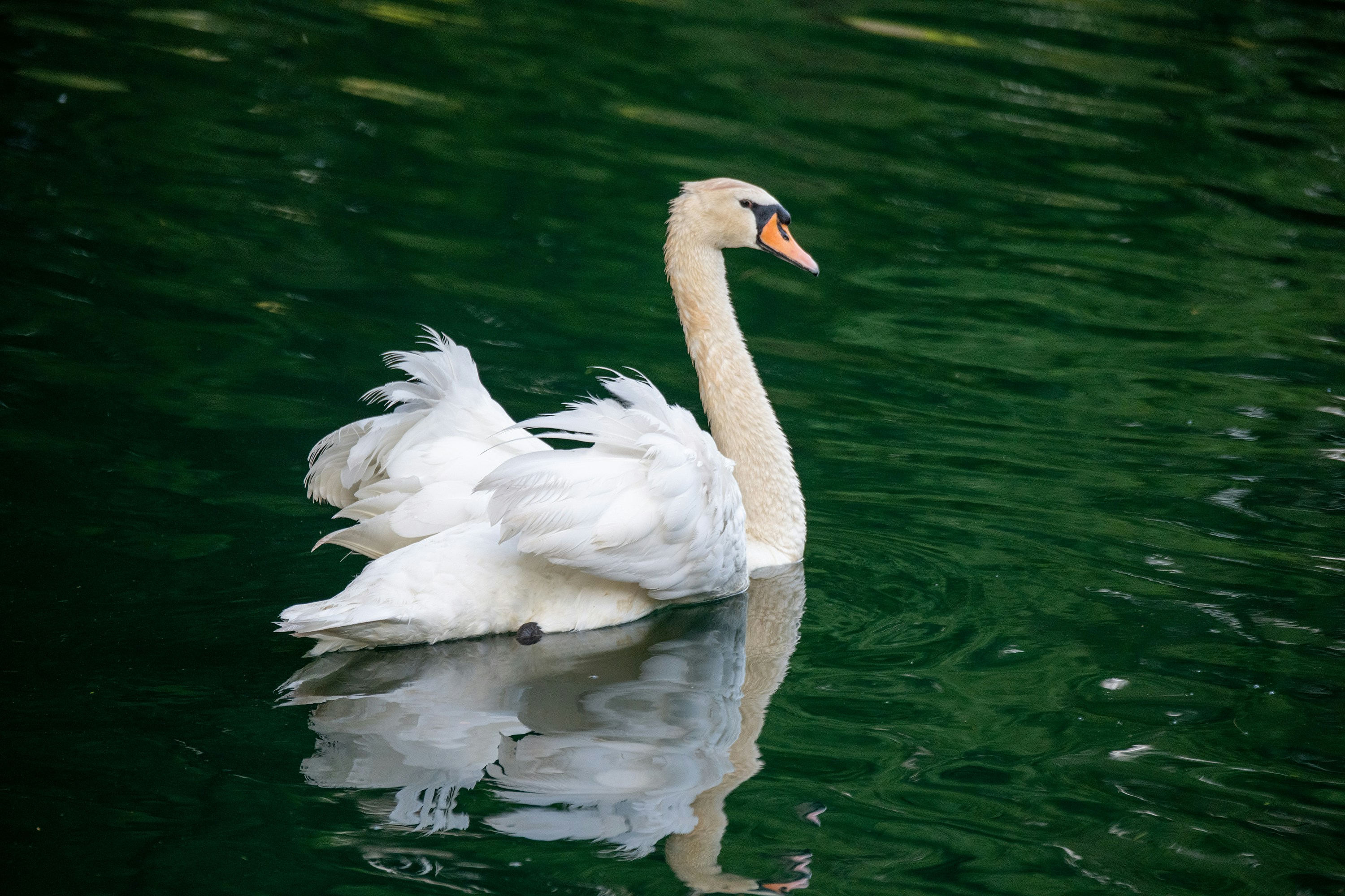 Mute swan swimming on green lake.