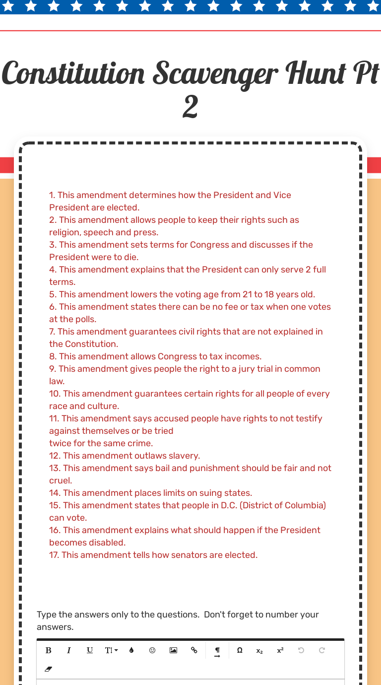 Constitution scavenger hunt worksheet. This scavenger hunt includes information on the Branches of Government voting amendments the Continental Congress and more. Showing top 8 worksheets in the category - Constitution Scavenger Hunt. Worksheet November 23 2018. Constitution Scavenger Hunt Worksheet Answer Key or 1010 Best 8th Grade Civics ...