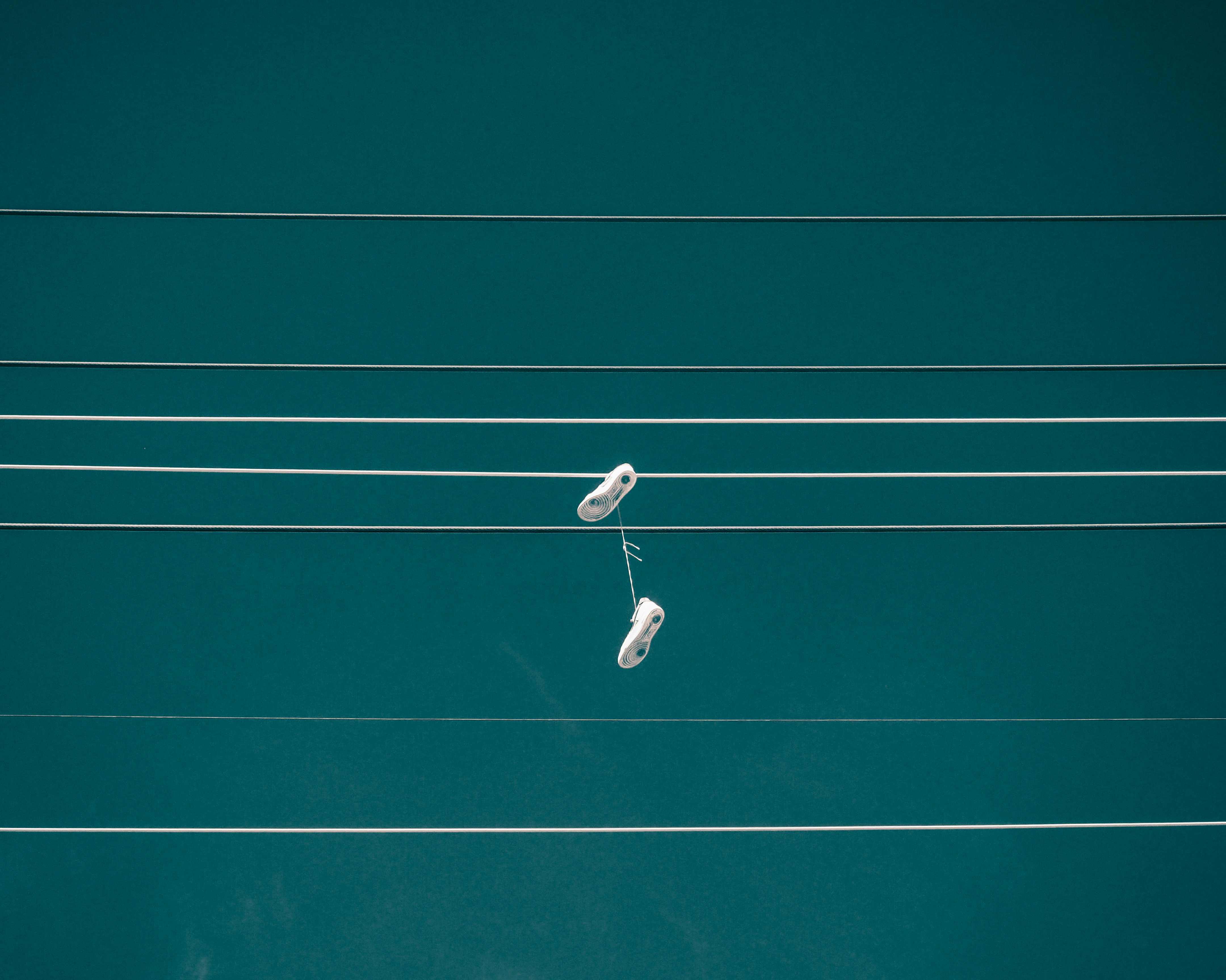 Hung Up. Random shoes, dangling from urban wires. Spotted at Paint Louis, 2018, near the Mississippi River.