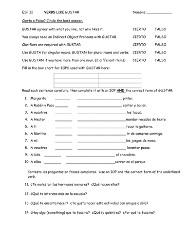 Gustar Verbs Worksheets - Teacher Page 10/28. …. This is a worksheet that practices the verbs in Spanish that function like the verb "gustar" (aka use indirect object pronouns).Includes gustar, encantar, aburrir, interesar, fascinar, doler. Fill in the correct object pronoun (me, This is the second worksheet that I have posted with gustar and ...