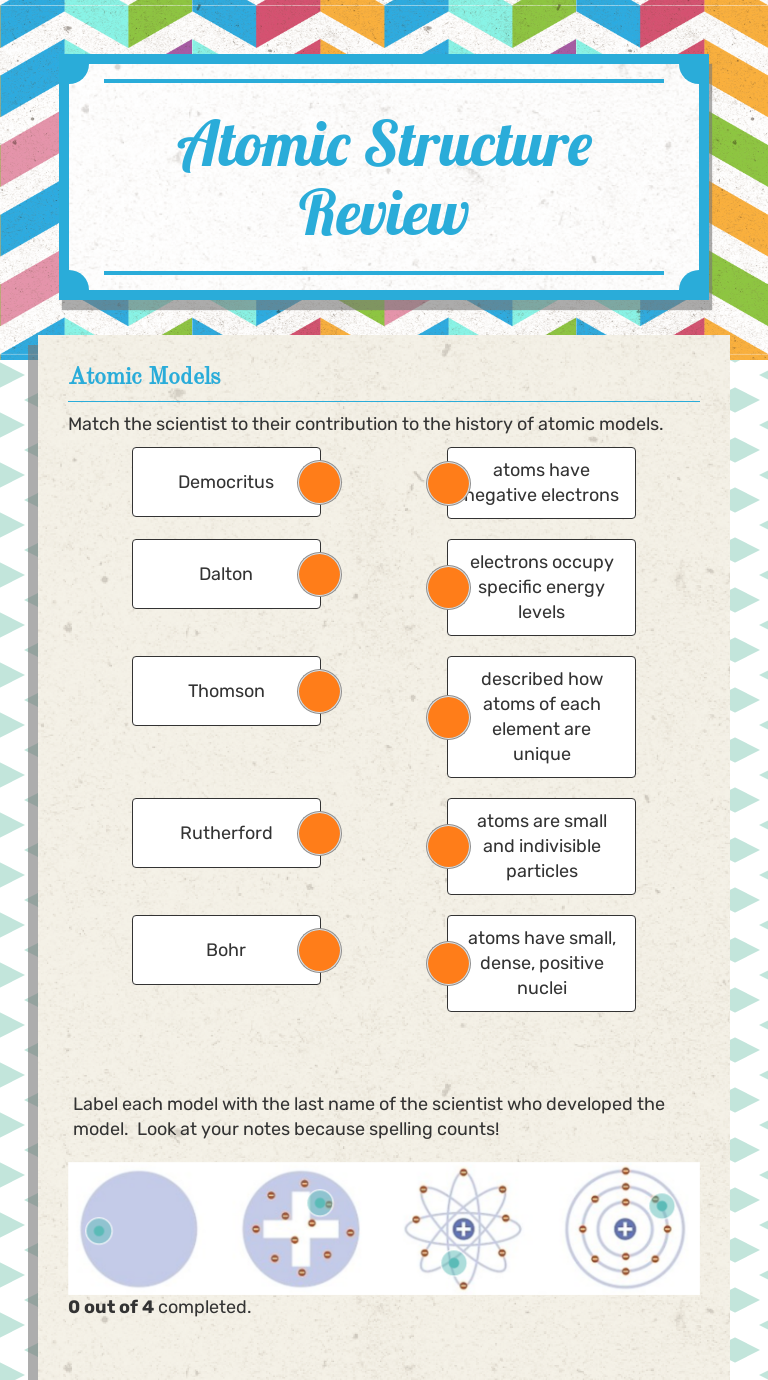 Atomic theory review worksheet answers. Atomic Theory Review Flashcards | Quizlet Unit 3 - Atomic Theory (With Pictures) Learn with flashcards, games and more — for free. A Greek philosopher who, in 450 BC, stated that all matter was made of various basic elements; that everything is composed of atoms; and that the different properties of atoms could be explained by their being... Gizmo Student Exploration Periodic Trends Answers ... 27.10.2021 · Student exploration gizmo answer key. You might be interested in. Student Exploration Balancing Chemical Equations Activity A Chemical Equation Equations Chemical The answer is the first option just took the test.Gizmo student exploration periodic trends answers. View these properties on the whole periodic table to see how they vary across periods and … FREE 7+ Sample Atomic Structure Worksheet Templates in MS Word With atomic structure worksheet, you are able to understand the two regions of atoms as to how they both Teachers giving a worksheet for their students to answer is a perfect strategy of finding out how Studying the structure of atoms can only be done through atomic theory. A discussion of the... Lesson Worksheet:Modern Atomic Theory | Nagwa In this worksheet, we will practice describing the concepts of modern atomic theory. Q8: According to the modern atomic theory, which of the following is correct? AThe electron behaves as a wave only.