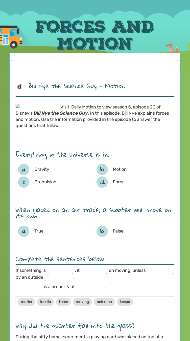 Bill Nye Motion Quiz Answer Key Pdf | GustavoGargiulo free ... Bill nye the science guy motion worksheet answer key pdf This fun and engaging worksheet and review PowerPoint is designed to accompany Bill Nye the Science Guy - Motion and was created for upper elementary middle school or early high school students and is a great way to introduce conclude or re-teach motion Newtons laws force inertia and ...