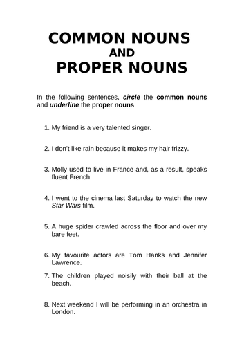 Proper noun and common noun worksheet