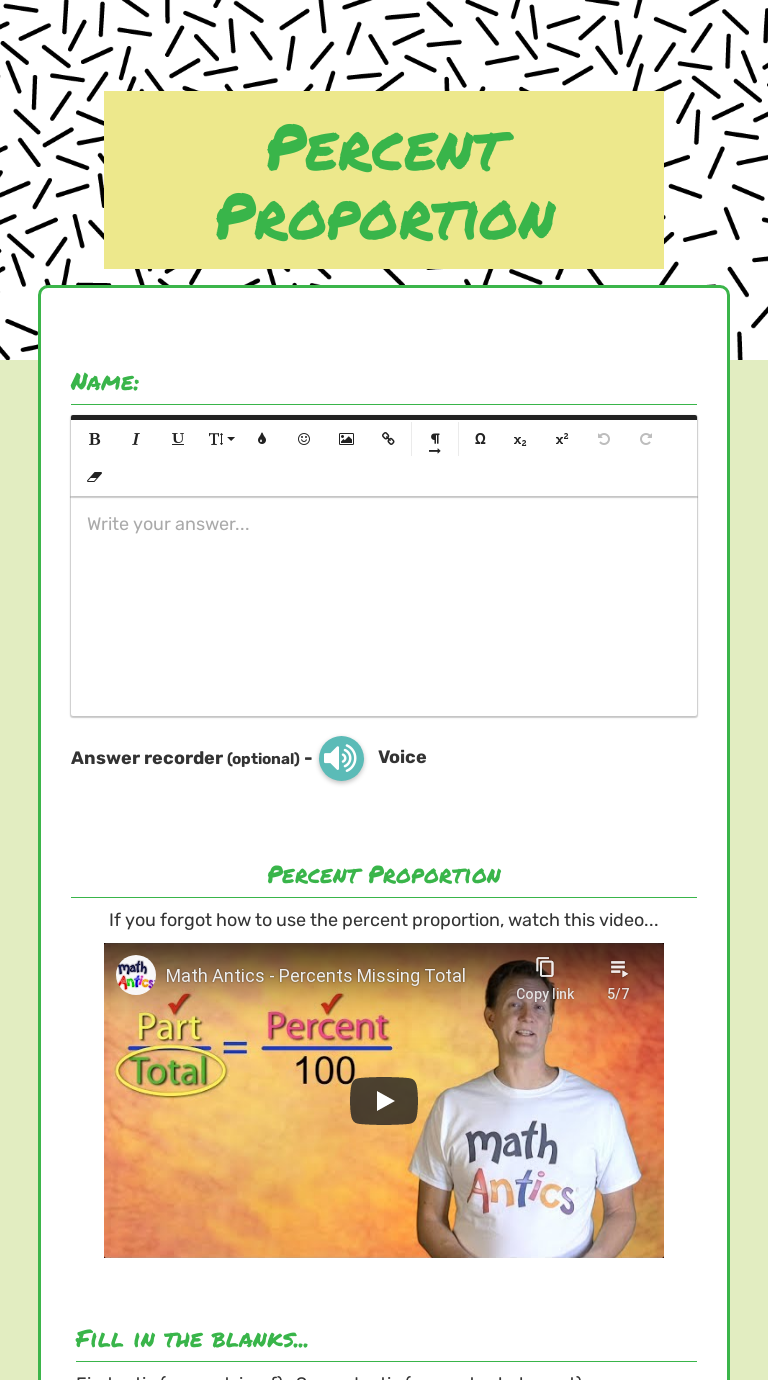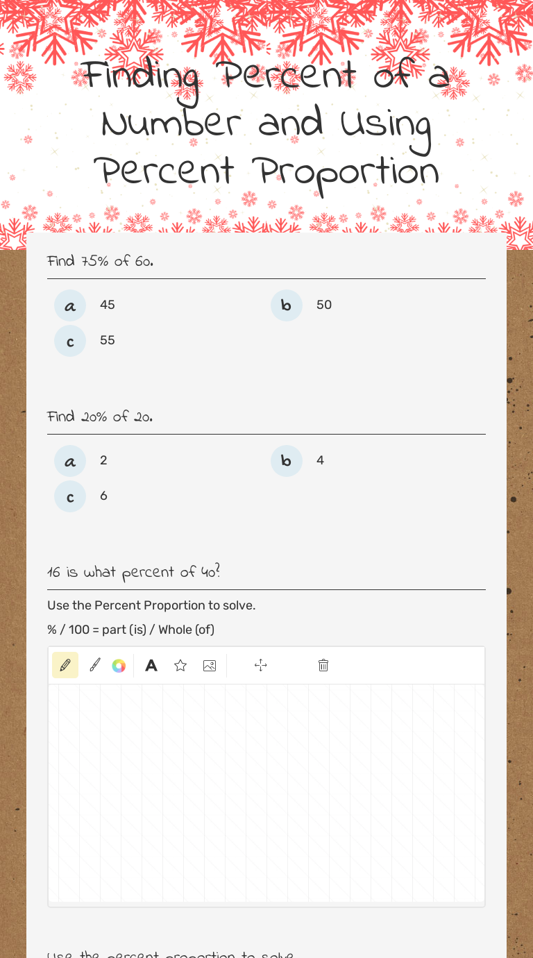 Percentage worksheets and online exercises Percentage worksheets and online activities. Free interactive exercises to practice online or download as pdf to print. All worksheets Only my followed users Only my favourite worksheets Only my own worksheets. Practice: The Percent Proportion Grade/level: 6, 7, 8 by dsarka. What percent is it?