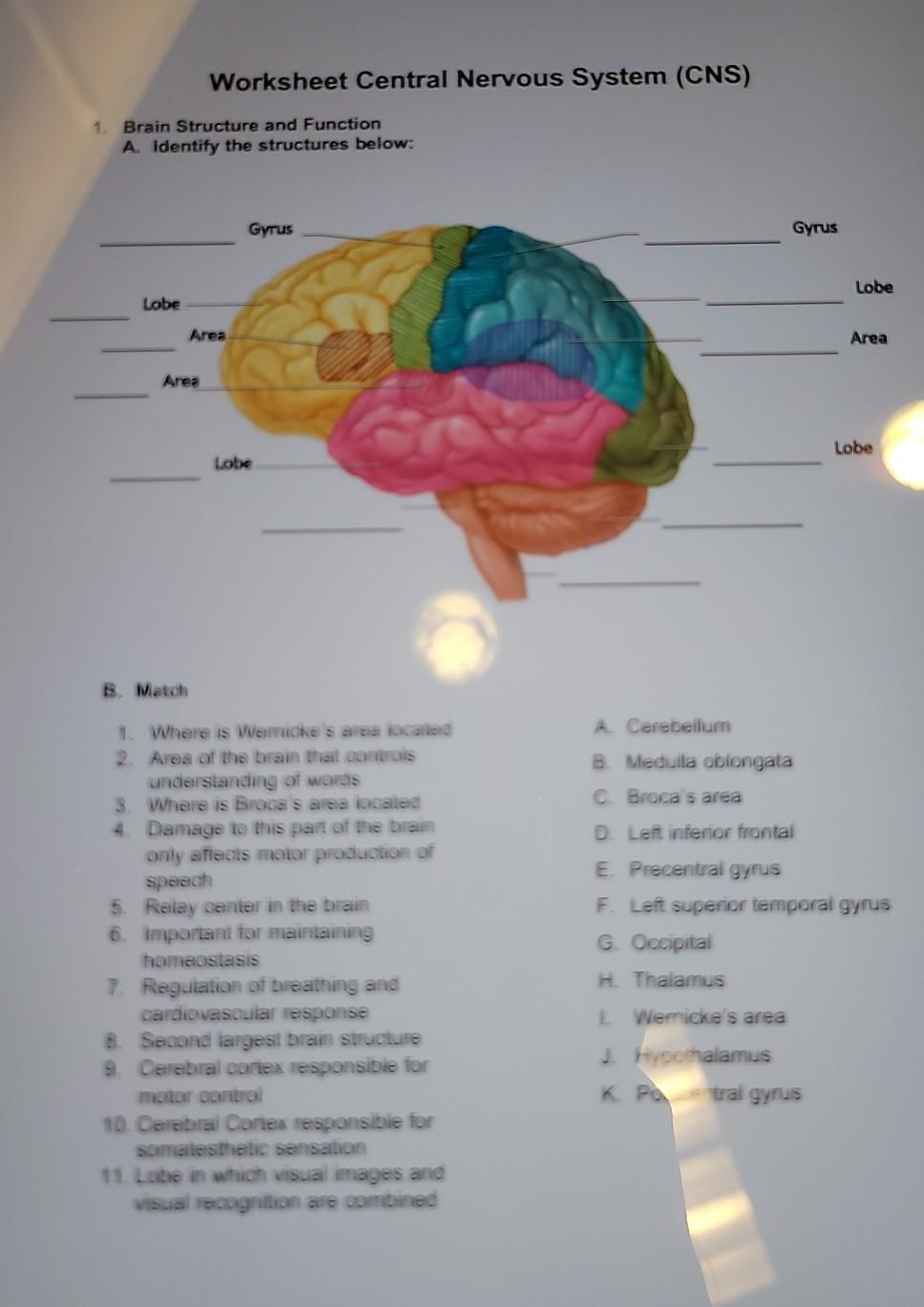 Nervous System: Brain Structure and Function Worksheet ... Start studying Nervous System: Brain Structure and Function Worksheet. Learn vocabulary, terms, and more with flashcards, games, and other study tools. PDF Students' Worksheets Brain Stomach ACTIVITY 3: A) With your partner find more examples as in activity 1 and follow the steps that the nervous system does. B) Ask and answer questions about the nervous system Use these structures: How fast do nerves work? How does the brain communicate with nerves located in the leg ? The brain is the most important organ because... PDF Biology Study Packet the Brain Set of Brain Anatomy Worksheets for each student Colored pencils for each student Scissors to cut out brain flaps Glue or tape to glue brain flap Slide show included online with this activity Instructions: 1. Read the Background information section "the brain and its parts". 2. Before coloring: The Brain: Parts - PBS Important Parts of the Brain Stem •Medulla-controls many vital autonomic functions such as heart rate, breathing and blood pressure. •Pons -helps coordinate