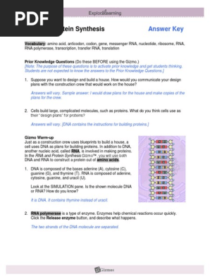 RNAProteinSynthesisSE KEY | PDF | Translation (Biology) | Rna RNA and Protein Synthesis. Answer Key. Vocabulary: amino acid, anticodon, codon, gene, messenger RNA, nucleotide, ribosome, RNA, RNA polymerase, transcription, transfer RNA Gizmo Warm-up Just as a construction crew uses blueprints to build a house, a cell uses DNA as plans for building proteins.