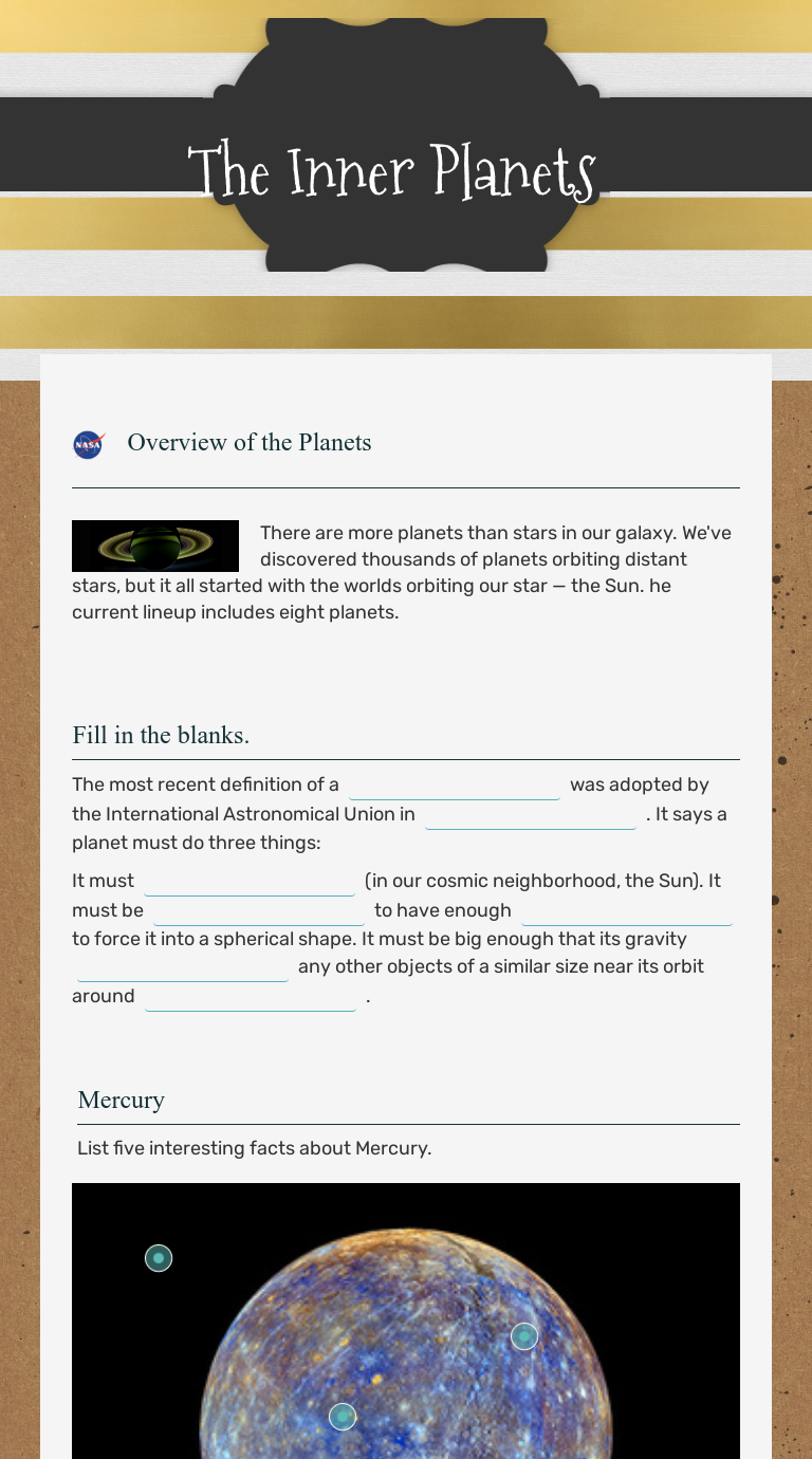 The Inner Planets Worksheets & Teaching Resources | TpT 9. $35.00. Zip. Zip file of the complete Unit IV Astronomy "The Inner Planets." Includes an assessment folder with answer keys; student worksheets, texts, activities and reviews in both Word and PDF format.Files also include two comprehensive PowerPoint lessons with up-to-date information and instructor slide sorte.