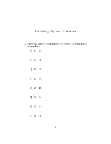 Factoring - Common factor only Worksheets Factoring-Common-factor-only-easy.pdf. Download. Downloads: 10156 x. Factor the common factor out of each expression. This free worksheet contains 10 assignments each with 24 questions with answers. Example of one question: Watch bellow how to solve this example: YouTube.
