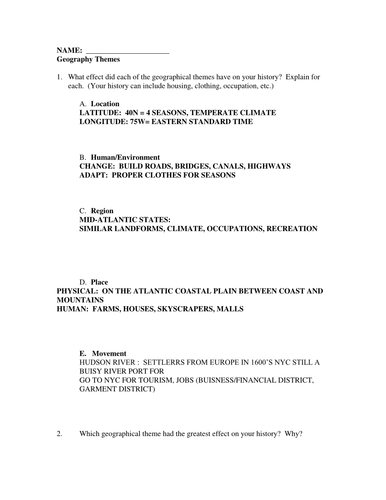 5 Themes Of Geography Worksheet Part 1 Answers - Vegan ... 5 themes of geography worksheet part 1 answers. 5 Themes of Geography Name. Describe how the events in the story illustrates cooperation or conflict among people and places. Five Themes of Geography Definitions. Geography Add to my workbooks 3 Download file pdf Embed in my website or blog Add to Google Classroom.