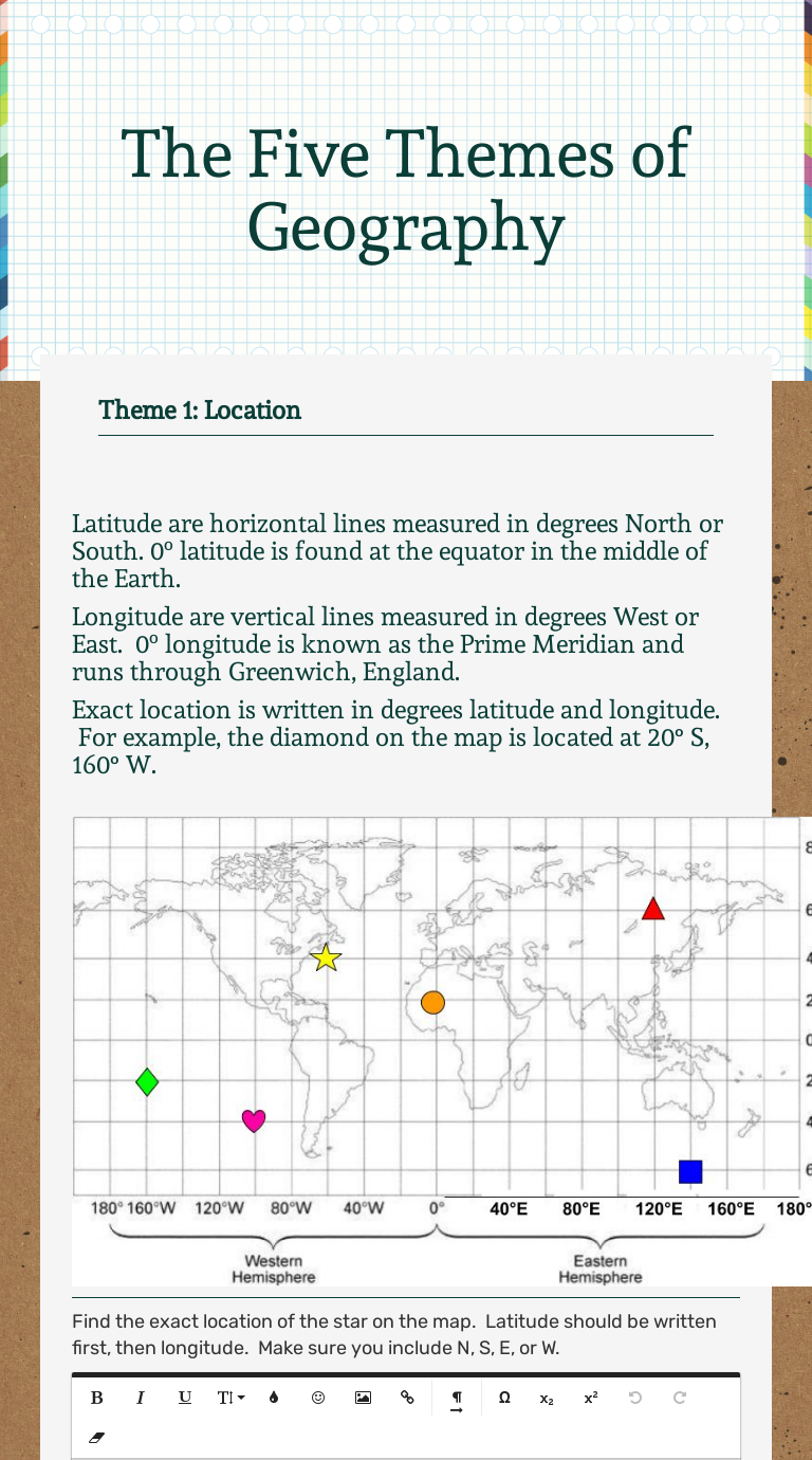 5 Themes Of Geography Worksheet Answer Key ... 5 themes of geography worksheet 9th grade answer key. Location place region movement human environment interaction 5 themes of geography cut on the lines. 1 30N 15W 2 45S 45E 3 30S 60W 4 15N 30E 5 30N 60W 6 45N 45E 7 60S 60W. This would work great as a station activity or a museum activity where these are hung around the classroom. PDF Five Themes of Geography Project - Cabarrus County Schools The Five Themes of Geography Geography is the study of the earth, it's land, it's people and it's environments. When you study geography, you should be looking at five distinct themes. Directions: Cut out the entire flippable. Cut the lines in between each theme up to the side bar. Place glue on the back of the sidebar and glue into notebook. 5 Themes Of Geography Worksheet 9th Grade Answer Key ... Five themes of geography answer key 1. Location place region movement human environment interaction 5 themes of geography cut on the lines. 5 themes quiz answer key use each theme only 2 times. The five themes of geography worksheet. In defining the geography of a location one must consider its location as well as its political. Five Themes Of Geography Worksheet - Diy Color Burst 5 Themes Of Geography Place. 5 Themes Of Geography. Christian Home School Hub World Geography Teaching Resources Downloads Geography Lessons Teaching Geography Five Themes Of Geography For full credit write in COMPLETE SENTENCES. Five themes of geography worksheet. Displaying top 8 worksheets found for 5 themes geography sixth grade. Five Themes Of Geography Answers.