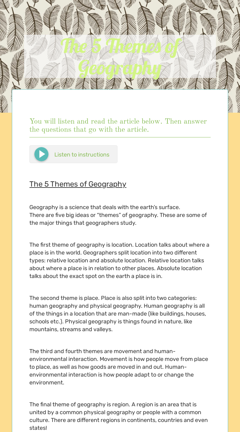 Five Themes Of Geography Mini Quiz Pdf - Sixteenth Streets Five Themes Of Geography Mini Quiz Pdf. Five themes of geography 1. Choose a country anywhere in the world; Geography Five Themes Quiz Geography Science Free 30 from Every point on earth has a specific location that is determined by an imaginary grid of lines denoting latitude and longitude. A group of places unified