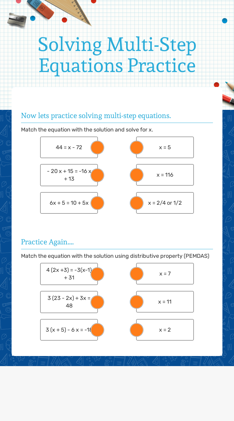 Multi Step Equations Practice Worksheets & Teaching ... Solving Multi-Step Equations Digital Practice for Distance Learning (positive and negative numbers)This product is a Google Slides product- students can complete it digitally. Included in this product: -10 different solving multi-step equations practice worksheets. -Answer KeysCheck out my other Dis