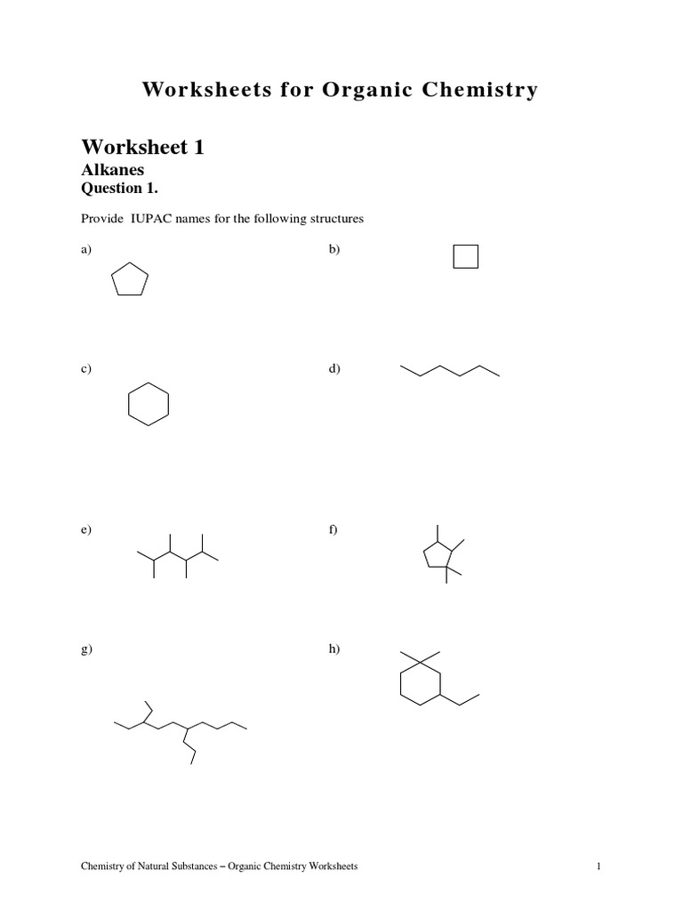 DOC Organic Reaction Worksheet - Chemistry Organic Reaction Worksheet. Fill in the table below. Be sure to complete the example reaction as well as fill in all other blanks. Be complete in your answers. Organic Reaction Description Example a. Addition Double bond breaks something is added. CH2=CH2 + Cl2 ( CH2CH2. b.. Organic Chemistry Nomenclature Practice Problems With Answers Organic Chemistry Nomenclature Practice Problems With Answers. by Amanda on January 30, 2022. January 30, 2022 on Organic Chemistry Nomenclature Practice Problems With Answers. Organic Chemistry Naming Substituted Hydrocarbons Worksheet Lesson Planet Chemistry Worksheets Word Problem Worksheets Algebra Equations Worksheets. PDF Worksheets for Organic Chemistry - van Maarseveen Chemistry of Natural Substances - Organic Chemistry Worksheets 16 Question 6. Five organic liquids are subjected to a series of distinguishing tests to help determine their identity. The results are tabulated below. From the following list of possibilities, determine the identity of each liquid. Note that there may be more than one answer.