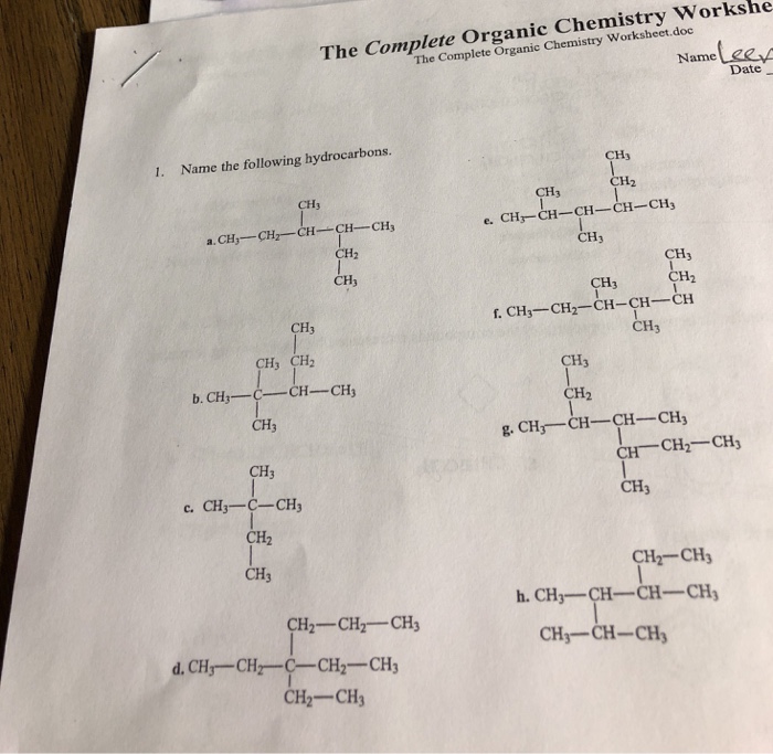 Complete organic chemistry worksheet answers - SlideShare Complete organic chemistry worksheet answers. 1. The Complete Organic Chemistry Worksheet The Complete Organic Chemistry Worksheet.doc Name 1. Name the following hydrocarbons. 3 j'- d m.u q'Lxc.$'s i"'a.CH3-CH2-CH-CH-CH. I CHz I CHr CHr A A -k ,e*qt^'-tt i"' f"l-'"'-lu*",Uo..q b cur-f-is-a", ll "' cH: ?"