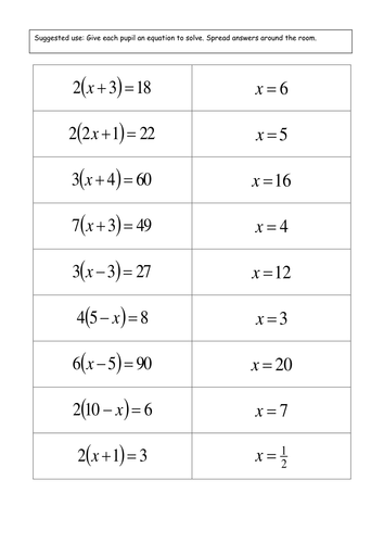 Solving equations distribution game/activity | Share My Lesson Solving equations distribution game/activity lesson plan template and teaching resources. This activity could either be a card sort or a shorter This activity could either be a card sort or a shorter form as a starter by giving each student an equation to solve and looking for the answer somewhere...