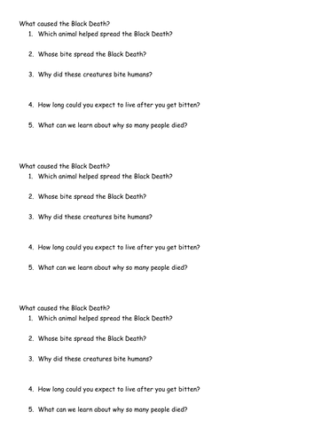 PDF The Black Death - Social Studies 9 1. Numbering of time line: 1. 1331, an outbreak of plague occurs in eastern Asia 2. 1338-1339, the Black Death spreads to western Asia 3. 1346, the Black Death reaches the coast of the Black Sea 4. 1347, ships sailing from Kaffa carry the plague to Constantinople 5. 1348, the Black Death reaches Spain 6. 1349, the Black Death spreads to ...