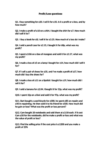 Profit and Loss Worksheet Pdf - Problems - Step by Step Solutions Please click here to download profit and loss worksheet as pdf document. Problem 1 : A man buy an article for $27.50 and sells it for $28.60. A person incurs 5% loss by selling a laptop for $1140. At what price should the laptop be sold to earn 5% profit ?