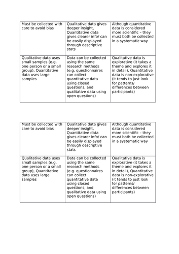 Qualitative vs Quantitative Observation Qualitative vs Quantitative Observation In any research or evaluation, observation plays a big part, as it is a very important way to collect information. It is not that both quantitative and qualitative observations remain exclusive to each other and have to be used in isolation. Main Difference - Quantitative vs Qualitative Research Quantitative and qualitative research methods are two general approaches to gathering and reporting data. Both these methods have their advantages and disadvantages, and each of these research approaches is suitable for answering particular types of questions. Qualitative vs. Quantitative - Graham Mueller Hour 8 It is... Qualitative Method vs. Quantitative Method Comparison.docx. University of Nairobi School of Biological Sciences. BIOCHEMIST 300. Qualitative_and_Quantitative_Worksheet. Virginia State University. QUANTITATIVE vs. QUALITATIVE REVIEW - Lemon Bay High ... QUANTITATIVE vs. QUALITATIVE REVIEW. QUANTITATIVE Data or Observations are things that can be measured – think quantity! Examples: 5 puppies.2 pages