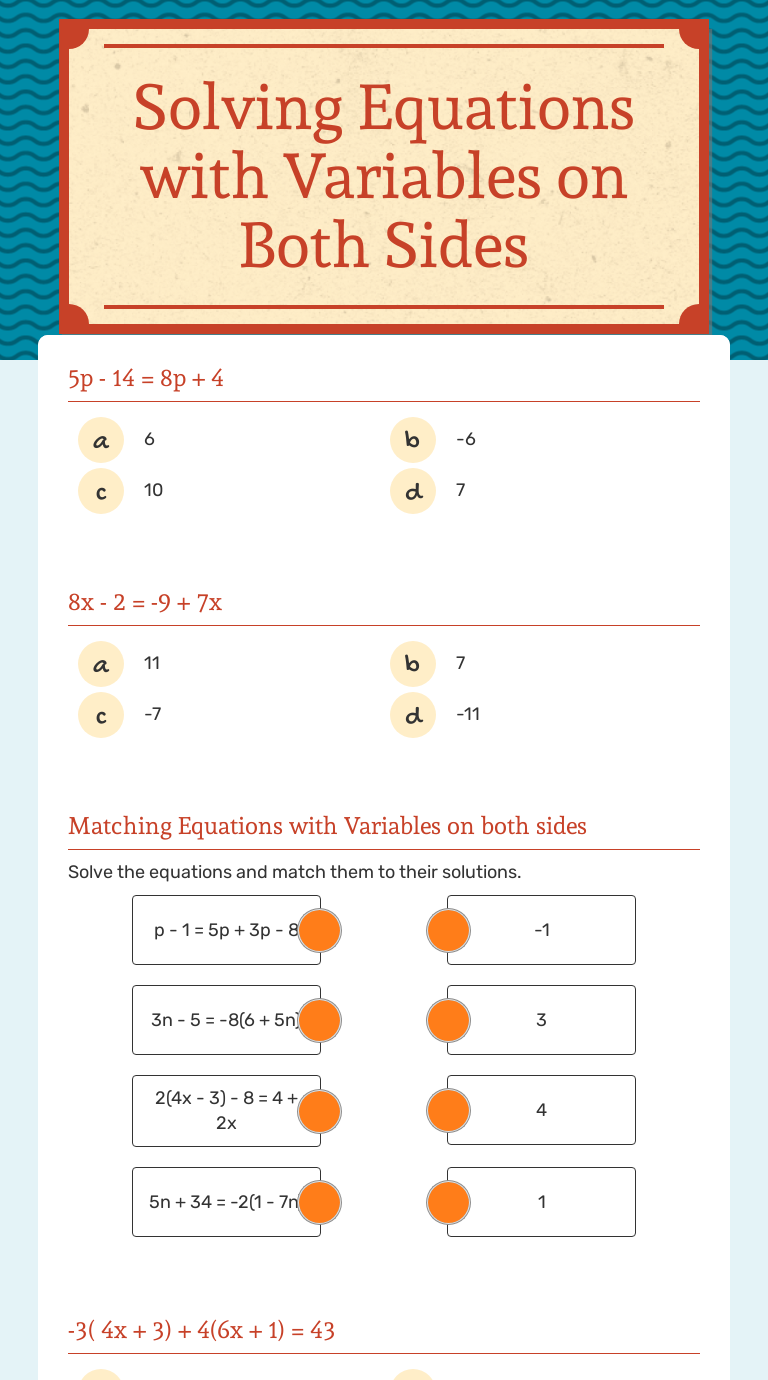 Solving Equations With Variable On Both Sides Worksheet | TpT Browse solving equations with variable on both sides worksheet resources on Teachers Pay Teachers, a marketplace trusted by millions of teachers for original educational resources.