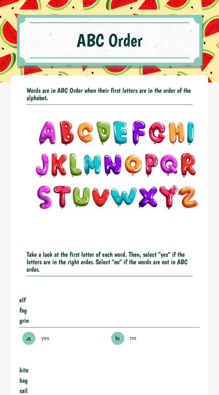 Alphabetic Order Worksheets Students work on arranging words and letters in order alphabetically. Alphabetic Order Worksheets. We know that Microsoft Excel and Google Sheets is just a click to do this, but what happens when the power goes out? Free Abc Order Worksheet Generator , Jobs EcityWorks ABC Order Worksheet Generator. Please Note: You are NOT logged in. Only members can print generated worksheets without a watermark. Worksheet Generator Make Your Own ABC Order Worksheet Use this alphabetical order generator tool to make a custom ABC order worksheet with... ABC Order Game | Free Game for Kids | Alphabetical Order In this ABC order game, put the word or letter blocks in alphabetical order (ABC order). Skills: Alphabetical Order, Drag & Drop. Put the word and letter blocks into alphabetical order (abc order). ABC order games help give young learners a head start on how spelling and word forming works. Sort into alphabetical order worksheet maker Worksheets. Maths Worksheet Generators (300+ generators with over 1500+ Skills). English Worksheet Generators (20+ A good tool for teachers). Use this alphabetical order or custom sort order generator tool to make a custom ABC order worksheet with your own word list or using the...