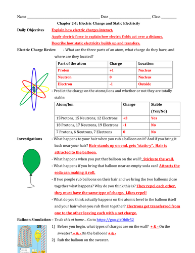 Charge and electricity worksheet answers. PDF Conceptual Physics Electrostatics and Static Electricity ... Conceptual Physics Electrostatics and Static Electricity Notes and Worksheets . Electrostatics is the study of electrical charges at rest. Charge is the fundamental aspect of all electrical phenomena. Electric Charge And Static Electricity Teaching Resources ... Engaging NGSS resource! Middle school students "play" with static electricity charges and are challenged by an electric field game. This is a straightforward 2 part worksheet (separated so they can be done individually) that guides students through 5 different online simulations (from two different websites) to explore the basics of electric charges and electric fields. Electrical Charges - Super Teacher Worksheets 3. 5. Page 2. ANSWER KEY. Super Teacher Worksheets - ...2 pages 12. b 13. a 14. a Key Terms (page 20) - 1. series circuit 2 ... Key Terms (page 20). 1. series circuit ... 4. static electricity metals attract. 7. copper ... An electroscope is used to detect electric charge. It.2 pages