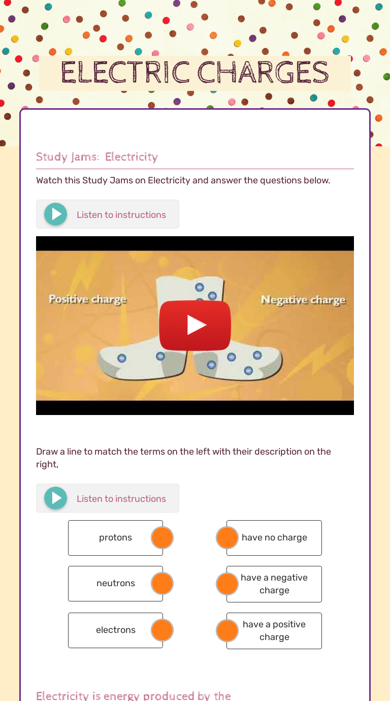 Electrical Charges Worksheet | Teachers Pay Teachers This 13 question video guide sheet provides a way for students to follow along with the Bill Nye Atoms video. The questions are all fill-in-the-blank. The video and worksheet introduce and explain the following concepts: protons, electrons, neutrons, electrical charge, carbon, matter, elements, per. Subjects: Chemistry, Science. Grades: 5th - 9th.