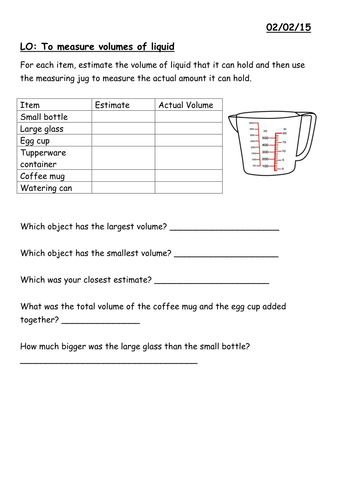 Measure Liquid Volume & Mass (examples, solutions, videos...) How to measure and estimate liquid volumes and masses of objects using standard units of grams, kilograms, and liters. Liquid volume is how much liquid something can hold. It is usually measured in milliliters (ml) or liters (l) We can use benchmarks to estimate liquid volume. Free Math Worksheets. Browse Printable Measuring Volume Worksheets | Education.com Practice measuring concepts and work on building your comparison skills with this fun worksheet that's all about liters! 3rd grade. Geometry: Counting Volume. Is your third-grader ready to start learning about volume? Introduce them to the concept with this clear and easily understood...