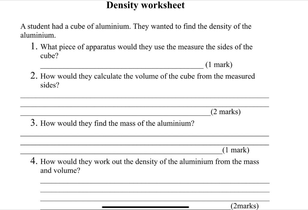Calculate Density, Mass and Volume Worksheet - EdPlace In this worksheet, students will calculate densities, masses and volumes. Density is an example of a compound measure, which is one that involves more than one unit of measurement. Density is a measure of mass (e.g. kg, g) in relation to unit volume (e.g. m3, cm3) and can be measured in...