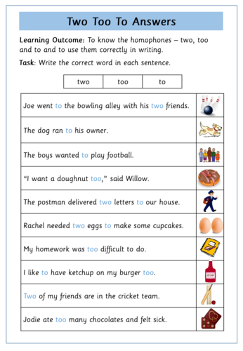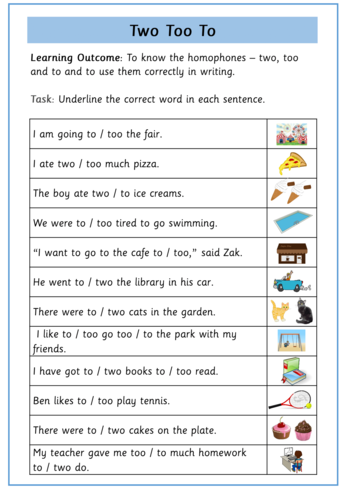 To, Too or Two Homophones Worksheet To, Too or Two Homophones Worksheet . Write which version of (to, too, two) that best completes each sentence. I had _____ go to school in the morning. (to, too, two) to 1. I have exactly _____ pairs of shoes under my bed. (to, too, two) 2. Do we have _____ put a feather in our cap? (to, too, two) 3. There are _____ potatoes left on our plates.