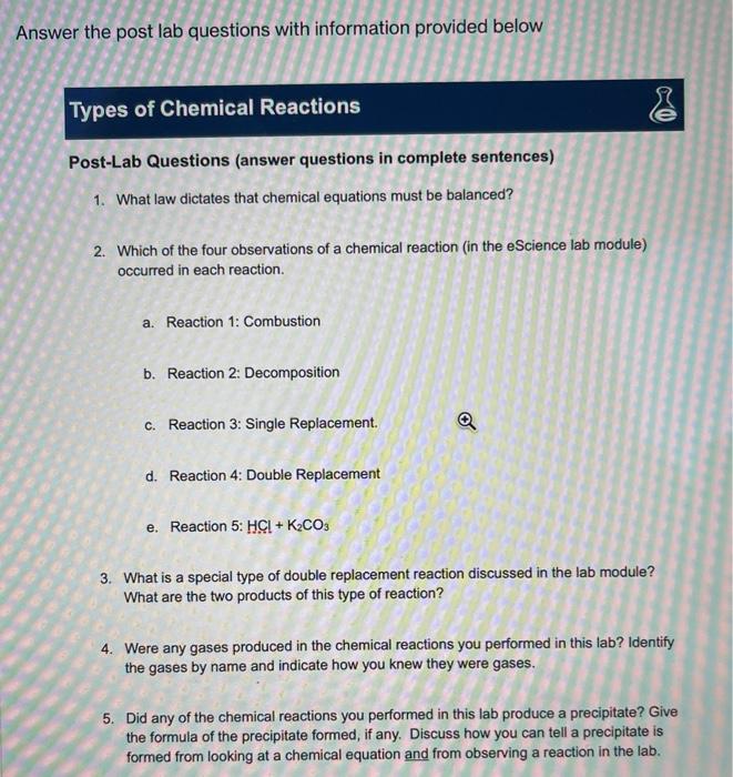 5 Types Of Chemical Reactions Lab With Worksheet & Answers ... All five of the basic types of reactions are represented in this lab. 5 types of chemical reactions lab with worksheet & answers. 5 types of chemical reactions lab with worksheet answers. Included you will find five pages of teacher notes that include detailed set up instructions along with tips that will insure a successful lab.