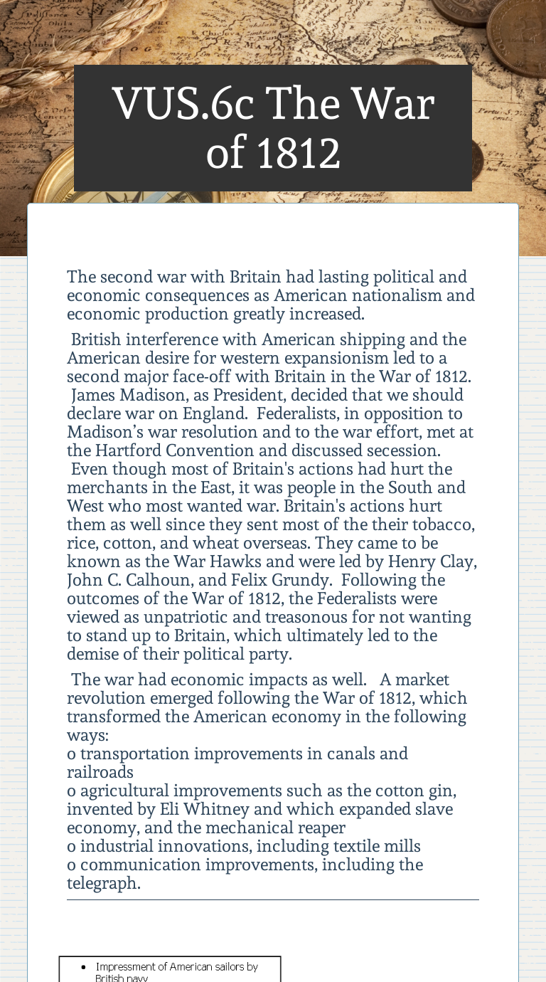 War of 1812 | Interactive Worksheet by Melissa Park | Wizer.me War of 1812 Worksheet. March 23, 2020. Impact. Write a paragraph explaining what you learned about the War of 1812 from this article. Include at least four to five sentences.