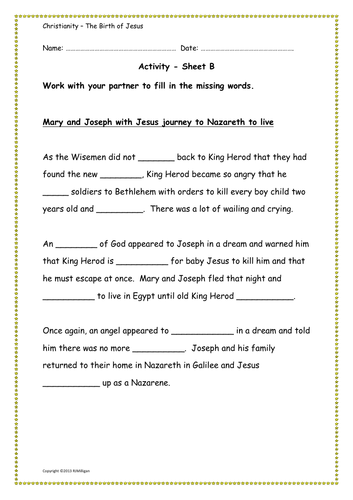 Birth of jesus worksheet. The Birth Of Jesus Teaching Resources - Teachers Pay Teachers 37. $3.50. PDF. This is a seven-page booklet about the birth of Baby Jesus. There are three versions: full page color, full-page black and white, and half-page black and white (to save on copies). I have also included six activities to go with the story: word search, crack the code, comic book page for retelling. Birth of jesus worksheet The birth of jesus online worksheet for GRADE 1. You can do the exercises online or download the worksheet as pdf. Nativity of Jesus Facts, Worksheets, Importance, Story ... The Nativity of Jesus, or the birth of Jesus, can be found in the books of Matthew and Luke in the Holy Bible.The two books state that Jesus was born in Bethlehem in the time of Herod the Great, the King of Judea. See the fact file below for more information on the Nativity of Jesus or alternatively, you can download our 22-page Nativity of Jesus worksheet pack to utilise within the classroom ... The Catholic Toolbox: Lesson Plan- Birth of Jesus (1st ... Birth of Jesus. Objectives: The students will be able to. - retell the story of Jesus' birth. - identify where Jesus was born and in what town. - identify that Jesus was born on Christmas. - identify Bethlehem on a map. Review: Prayer, questions and vocabulary words from last week's lesson. Vocabulary Words: (Write the words on the board ...