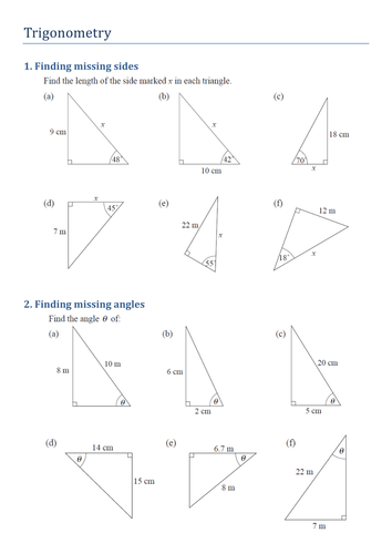 Trigonometric Ratios Worksheets Determine the Six Trigonometry Ratios. This array of pdf worksheets contains skills to find the three primary trigonometric ratios for the given angle, using the SOH-CAH-TOA; and flip the answers to get the corresponding reciprocal trigonometric ratios. ... The 1st part of the worksheet includes degrees while the 2nd has radians. › trigonometry-worksheet-11001068Trigonometry worksheet | Teaching Resources Feb 22, 2018 · A worksheet designed to be printed back to back and folded to make an A5 booklet. Trig Ratios to find missing lengths and angles together with questions on elevation/depression as well as bearings make for a good challenge. Answers are also provided on the worksheet so students are able to check their work and self assess. Trigonometry - Finding angles Worksheets This free worksheet contains 10 assignments each with 24 questions with answers. ... Downloads: 6965 x. Find the measure of the indicated angle to the nearest degree. This free worksheet contains 10 assignments each with 24 questions with answers. ... Beginning Trigonometry Finding angles Finding missing sides of triangles Finding sine, cosine ...