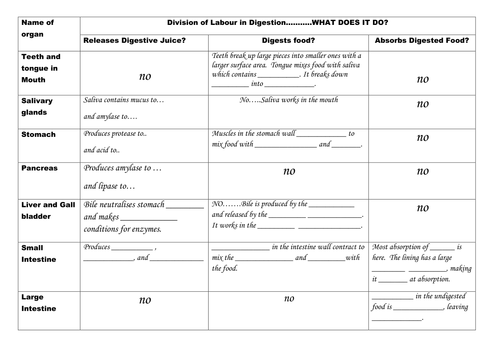 Digestion Enzymes worksheet - Liveworksheets.com Live worksheets > English. Digestion Enzymes. In this worksheet students will complete a table about digestive enzymes and juices. ID: 2311594. Language: English. School subject: Biology. Grade/level: Senior High. Age: 14+. Main content: Digestive Juices and Enzymes.