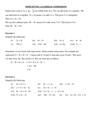 PDF Simplifying algebraic expressions worksheets with answers pdf Simplifying algebraic expressions worksheets with answers pdf Learning Outcomes Identify the variables and constants in a term Identify the coefficient of a variable term Identify and combine like terms in an expression Algebraic expressions are made up of terms. A term is a constant or the product of a constant and one or more variables ...