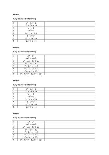 math.uiowa.edu › files › FactoringWorksheetFactoring and Solving Quadratic Equations Worksheet Factoring and Solving Quadratic Equations Worksheet Math Tutorial Lab Special Topic Example Problems Factor completely. 1. 3x+36 2. 4x2 +16x 3. x2 14x 40 4. x2 +4x 12 5. x2 144 6. x4 16 7. 81x2 49 8. 50x2 372 9. 2x3 216x 18x 10. 4x2 +17x 15 11. 8x2 15x+2 12. x3 3x2 +5x 15 13. 5rs+25r 3s 15 14. 125x3 64 15. 2x3 +128y Solve the following ...