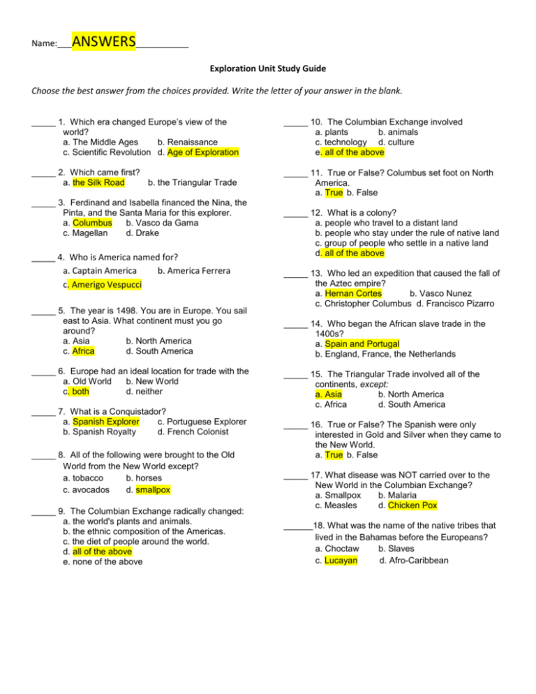 Explorers come to the new world worksheet answers. Chapter 1, A New World, A Guided Reading Flashcards | Quizlet When Jamestown was officially established, it marked the beginning of a new era and the framework of a new nation. Cultures of Central and South America... There were 3 main civilizations -Mayas (cities in the rain forest, majored in corn) -Aztecs (Mexico & Central America. Majored in corn production) -Incas (South America, and majored in potatoes) Across the Sea: Europeans Explore the New World - Education World Soon, the explorers would introduce plants/foods from the Old World to the Americas. You might draw a second arrow on the board -- from the Old World to the New World -- and post appropriate drawings or images around it. Adapt the Lesson for Younger Students Younger students will not have the ability to research foods that originated in the New ... 7 Early Explorers Activities - Vestal's 21st Century Classroom A Letter From a Famous Explorer. I am always looking for ways to integrate social studies and ELA. During my explorers unit, students select a famous explorer and write a letter from the perspective of that explorer.While including important information about that explorer, students should also consider what that person might have been feeling as they explored the new world. PDF GA Studies CRCT Study Guide - ANSWER KEY • A - The smallest of the five regions • C - The site of the first U.S. gold rush • D - The most populated region • A - GA's only source of a fossil fuel • C - The highest peak, Brasstown Bald • D - Contains Georgia's peaches • A - Includes only Dade and Walker County • D - The industrial/business heart of Georgia
