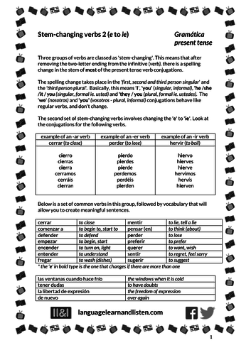 Stem Changing Verbs Spanish Worksheets Teaching Resources | TpT Spanish Stem Changing Verbs Practice Worksheets by Island Teacher 14 $3.50 PDF Present Tense Stem Changing Verbs Worksheets to use with your students for class practice or homework after introducing stem changing verb conjugations. Stem-changing Verbs Worksheets & Teaching Resources | TpT Spanish Stem Changing Verbs Grammar Activities by Spanish Made Easy 35 $5.00 PDF This is a 24 page Spanish grammar practice packet over present tense stem-changing (boot) verbs. This packet contains everything you need to help your students learn to conjugate e-ie, e-i, o-ue, and u-ue stem-changing verbs in the present tense.