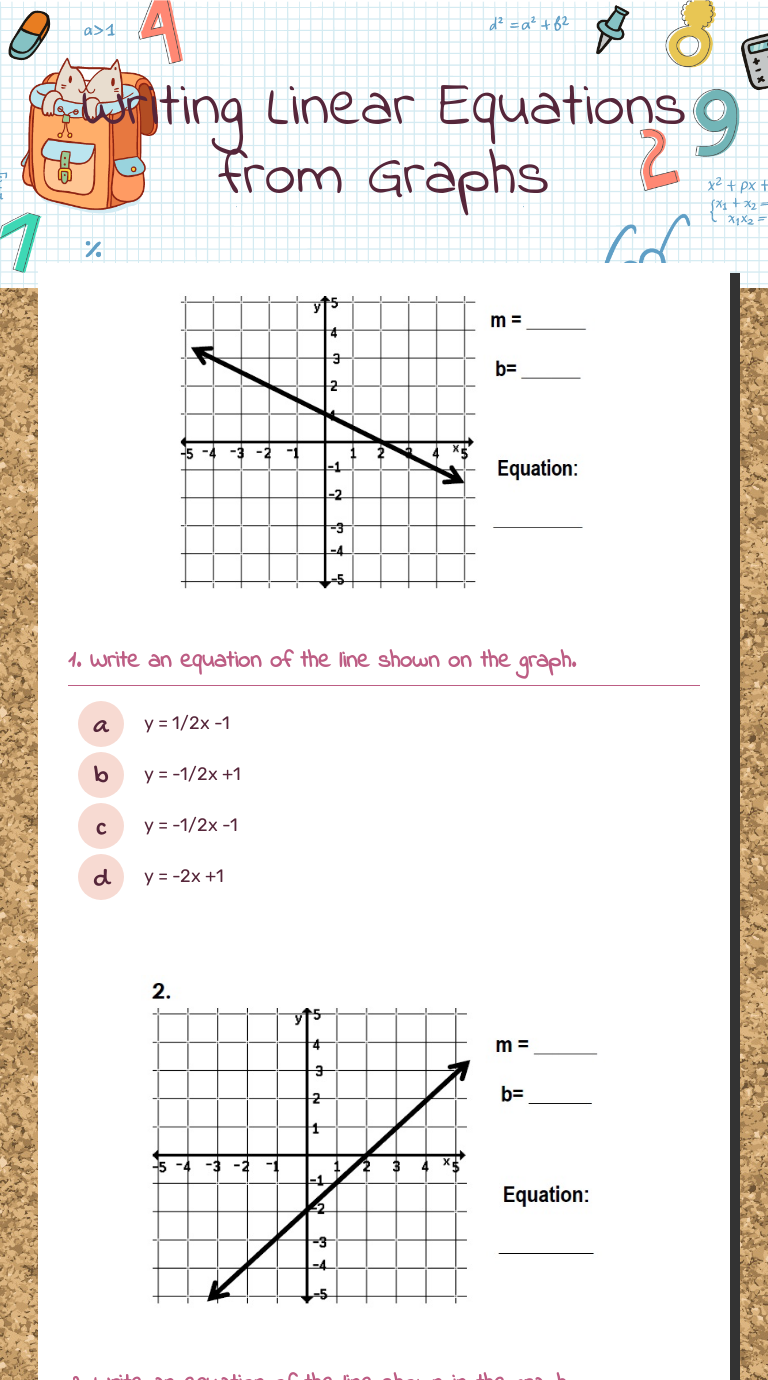 Writing equations from graphs worksheet. Write Equations in Slope-Intercept Form From Graphs | Worksheet ... Students gain practice writing equations in slope-intercept form from graphs in this eighth-grade algebra worksheet! In this two-page practice worksheet, students are asked to find the slope and y-intercept of graphed lines and write the equation of those lines in slope-intercept form.Understanding how to write equations in slope-intercept form will help students to model linear relationships ... Writing Quadratic Equations From Graphs Worksheet Pdf The Graph A Linear Equation In Slope Intercept Form A Math Worksheet From The Algebra Wor Graphing Linear Equations Linear Equations Writing Linear Equations . Pin On Algebra . Pin By Algebra Class On Algebra Cheat Sheets Graphing Linear Equations Slope Math Ged Math . Comparing Quadratic Graphs Quadratics Quadratic Functions Graphing PDF Unit 2-2: Writing and Graphing Quadratics Worksheet Practice PACKET Unit 2-2: Writing and Graphing Quadratics Worksheet Practice PACKET Name:_____Period_____ Learning Targets: Unit 2-1 12. I can use the discriminant to determine the number and type of solutions/zeros. Modeling with Quadratic Functions 1. I can identify a function as quadratic given a table, equation, or graph. 2. Writing Quadratic Equation From Graph Worksheet - Tessshebaylo Write The Quadratic Function Functions Quadratics Graphing. Gmmfowrcpkm001 2019 10 10آ Practice Worksheet Graphing Quadratic Functions In Intercept Form For Pdf Document. Worksheet practice packet quadratic functions transformation graphing linear equations vertex form of a equation.