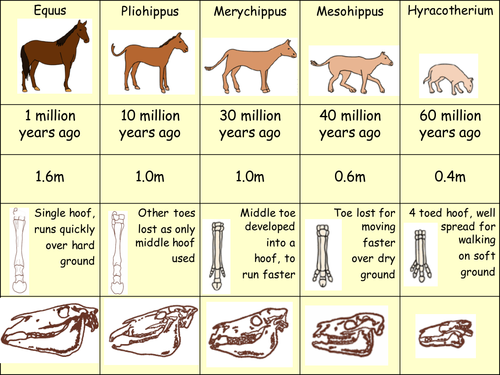 Evolution of the horse worksheet answers. Evidence of Evolution Packet Flashcards | Quizlet Thus, the individual development of an animal occurs through a series of stages that paint a broad picture. of the evolutionary stages (phylogeny) of the species to which it belongs. "Ontogeny recapitulates Phylogeny", Haeckel. type of movement human limb is responsible for. Using tools, picking up and holding objects. Evidence of Evolution Answer Key - Evidence of Evolution ... - StuDocu This is a series of skulls and front leg fossils of organisms believed to be ancestors of the modern-day horse. Equus (modern horse) Pilohippus Merychippus Mesohippus Eohippus (Dawn Horse) Source: iq.poquoson. 1. Give two similarities between each of the skulls that might lead to the conclusion that these are all related species. (PDF) The evolution of the horse - researchgate.net The horse evolved over a 60 million years into an animal that man kind has relied on to help spread onto every corner of the planet. The original animal was termed Hyracotherium and its unique... PDF Evidence of Evolution-Answers in gray Background Fossils - Denton ISD 3. What is the biggest change in leg anatomy that occurred from the dawn horse to the modern horse? Fifty five million years ago, there was an animal the size of a small dog, called Hyracotherium (sometimes called Eohippus). Its front feet had four toes, and its back feet had three. Modern horse feet have a single hoof.