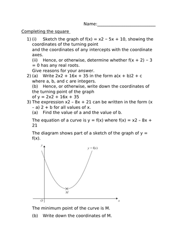 PDF Completing the Squareans - Maths Genie 5 by completing the square, find the coordinates ofthe turning point of the curve with the equation y x2 + 8x + 3 you must show all your working. 13 otal for question 5 is 3 marks) 6 by completing the square, find the coordinates of the turning point of the curve with the equation y + iox— 8 you must show all your working- 33 €5/-33) otal for …