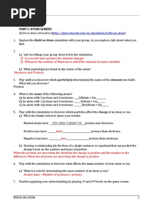 (PDF) ANSWER KEY : BUILD AN ATOM | Elle Richard - Academia.edu a) An atom with 3 protons and 4 neutrons: Lithium b) An atom with 2 protons and 4 neutrons: Heleum c) An atom with 4 protons and 4 neutrons: Beryllium 5. Play with the simulation to discover which particles affect the charge of an atom or ion. a) Fill in the blanks below to show your results: Neutral atoms have the same number of protons and ...