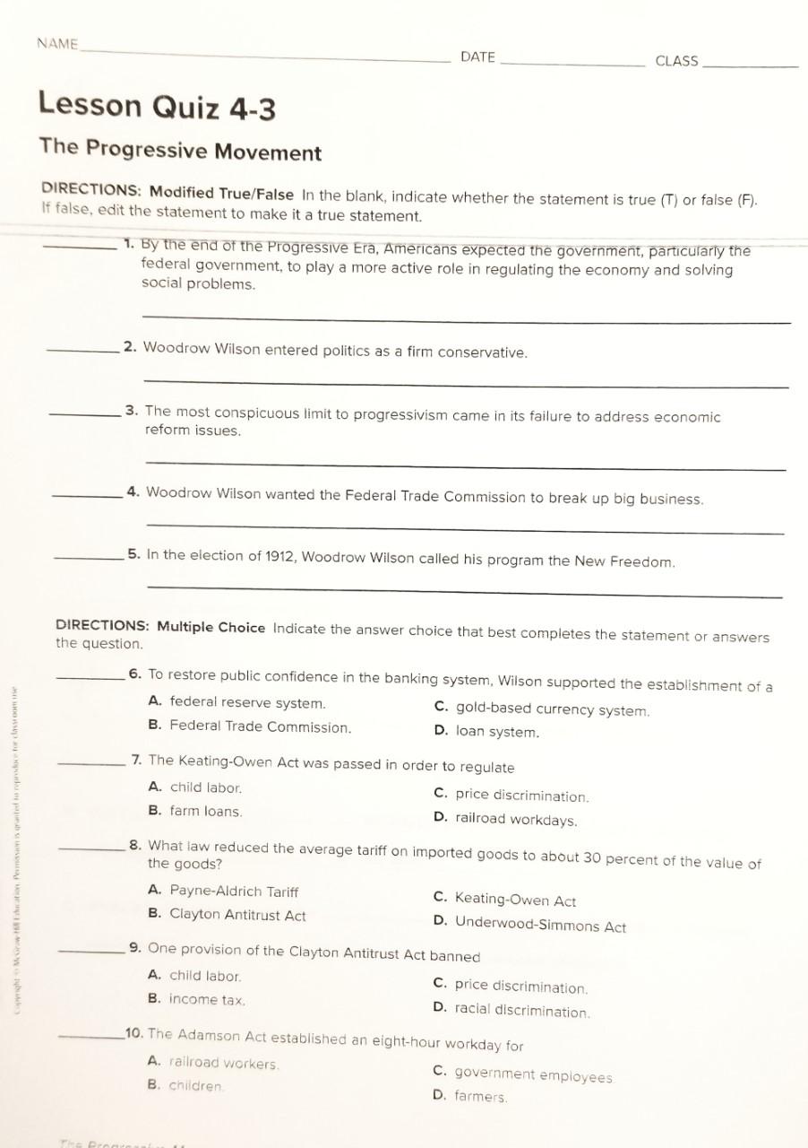 reforms of the progressive movement.docx - Course Hero The class votes and agrees on the following rules: I) Students who steal from other students will be punished without Q&A Choose the true statement about the War of 1898. During the war, the U.S. claimed Guam, Wake Island and parts of the Samoan Islands. Newspapers reported the explosion on the U.S.S. Maine was the Q&A Bookmarked 0 Recently viewed The Progressive Movement Worksheet Answers - acscu.net Which was one reform of the Progressive movement? - Answers The progressive movement brought about a reform in the election of US senators. The reform provided for the direct election of senators into the legislature. read more Reforms Of The Progressive Movement … PDF UNIT#3: THE PROGRESSIVE MOVEMENT KEY TERMS Chapter 8, Sections 1-3 (pgs ... Name: ___ANSWER KEY____ Hour: _____ UNIT#3: THE PROGRESSIVE MOVEMENT KEY TERMS . Chapter 8, Sections 1-3 (pgs. 290-317) Progressives: Urban, college-educated, middle class Americans, members of both political parties (Republicans and ... Political reform brought about by progressives, all party members can vote for a candidate to run in the ...